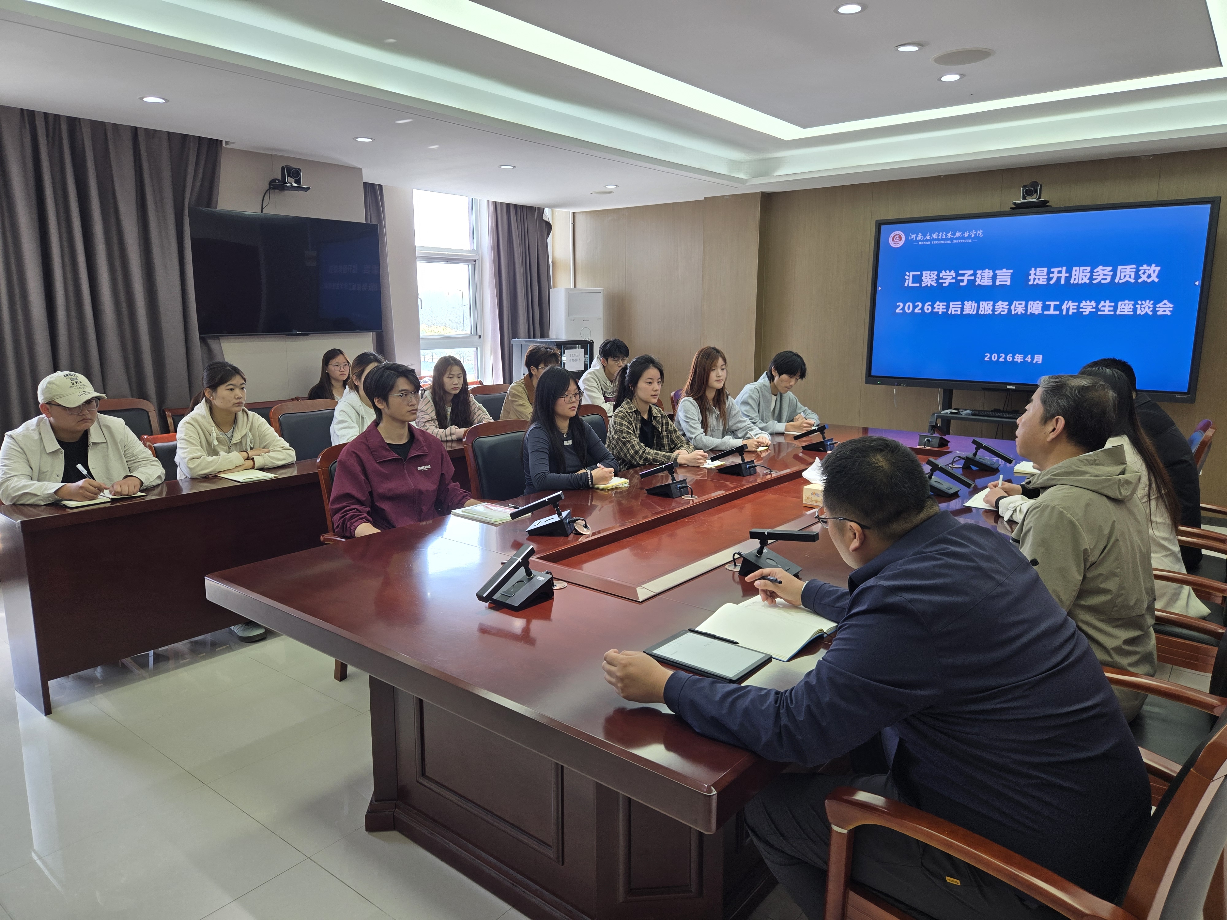 为进一步提升校园后勤服务质量,精准解决学生日常生活中的实际问题,4月9日至10日,后勤处在郑州校区、开封校区分别召开2026年后勤服务保障工作学生座谈会。党委学生工作部、团委等部门负责同志、餐厅物业经理、各二级学院学生代表参加会议。